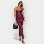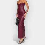 Tyto šaty se vyznačují odvážným charakterem a luxusní texturou kůže. Ideální pro výstřední vzhled, kombinují eleganci a dynamiku v každém svém detailu.