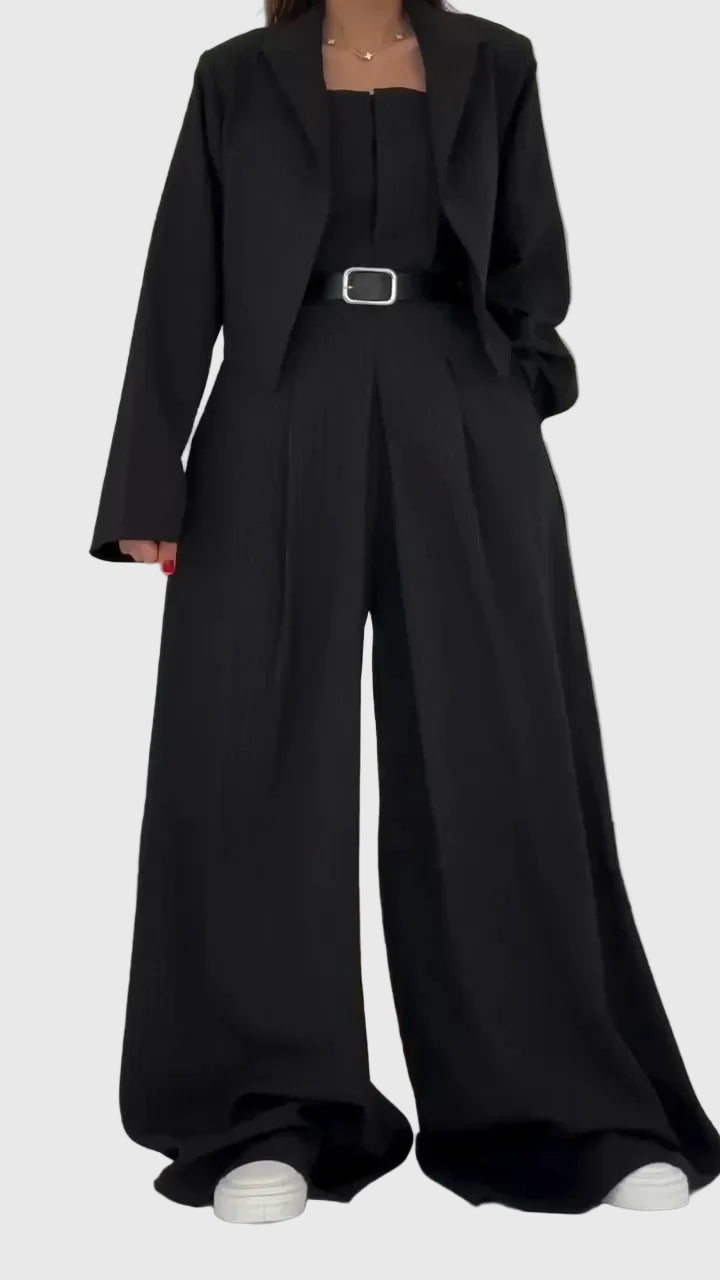 S ultra trendovými, volnými kalhotami, strukturovaným bustierem a odpovídající, splývavou bundou byl navržen tak, aby zdůraznil všechny siluety.
