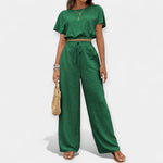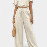 Tento set vyniká volným střihem a naprostým pohodlím, které nabízí. Krátký top s nafouklými rukávy se harmonicky kombinuje s vysokým kalhotami s tkaničkou, čímž vytváří stylový vzhled s boho akcenty – ideální pro nejteplejší dny v roce.