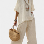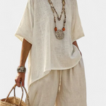 Čistá jednoduchost s přirozenou elegancí. Souprava Daisy vyniká uvolněnou a monochromatickou siluetou, ideální pro ty, kteří hledají pohodlí a čistý styl. Vyrobeno z lehkého materiálu, tento vzhled doprovází každý pohyb s svěžestí a elegantní uvolněností.
