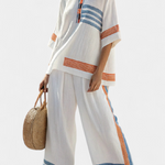 Strukturovaná svěžest s námořnickým pocitem. Sada Daisy vyniká svým čistým a moderním designem, obohaceným o ručně vyrobené detaily v živých barvách. Široká blůza a kalhoty s širokými nohavicemi vytvářejí uvolněnou siluetu, která vyzařuje lehkost a styl s osobností.