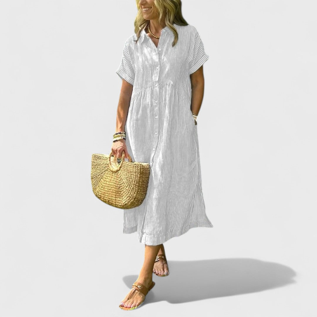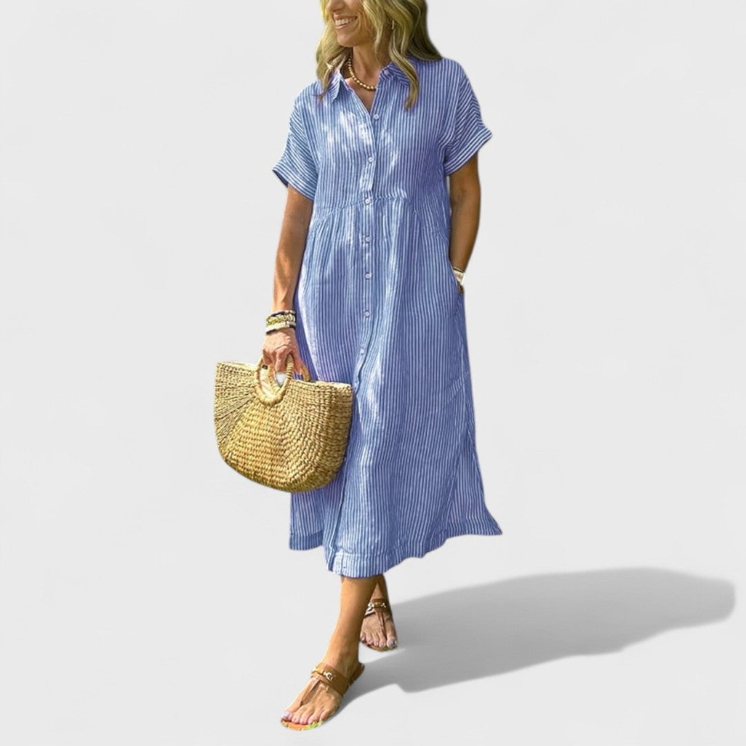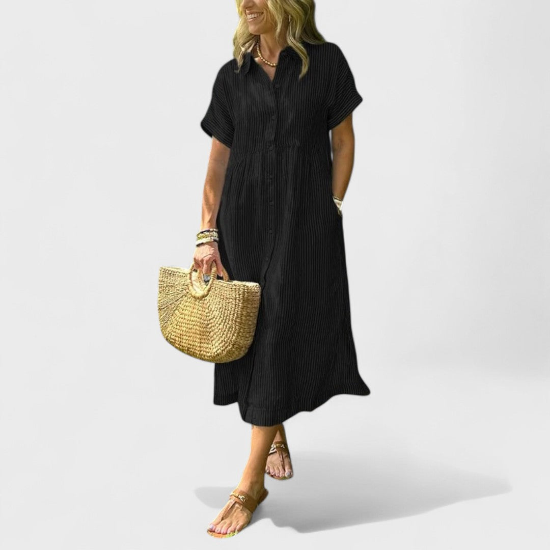 Šaty Angela vynikají svou delší délkou a nadčasovým střihem, který krásně zvýrazní pas a plynule splývá kolem těla. Vyrobené z měkkého, prodyšného materiálu, jsou ideální pro horké letní dny, romantické večery i slavnostní chvíle ve městě.