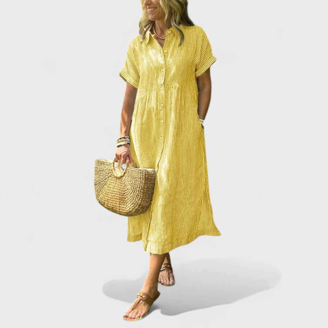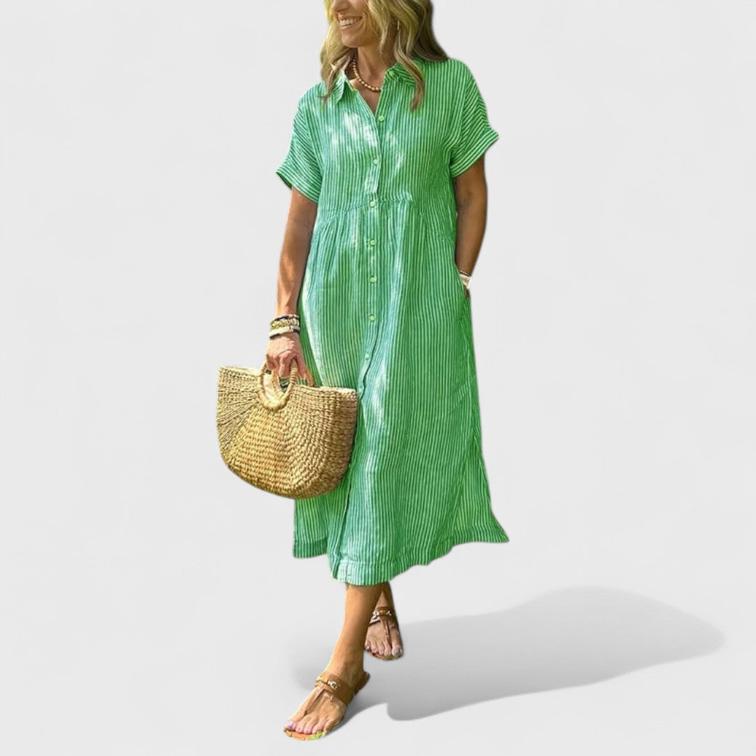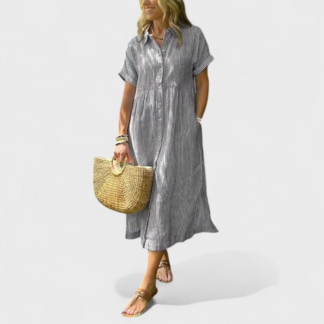 Šaty Angela vynikají svou delší délkou a nadčasovým střihem, který krásně zvýrazní pas a plynule splývá kolem těla. Vyrobené z měkkého, prodyšného materiálu, jsou ideální pro horké letní dny, romantické večery i slavnostní chvíle ve městě.
