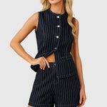 Komplet Dobromila spojuje bezrukávovou džínovou vestu na knoflíky s elegantními šortkami a vytváří moderní a univerzální vzhled.