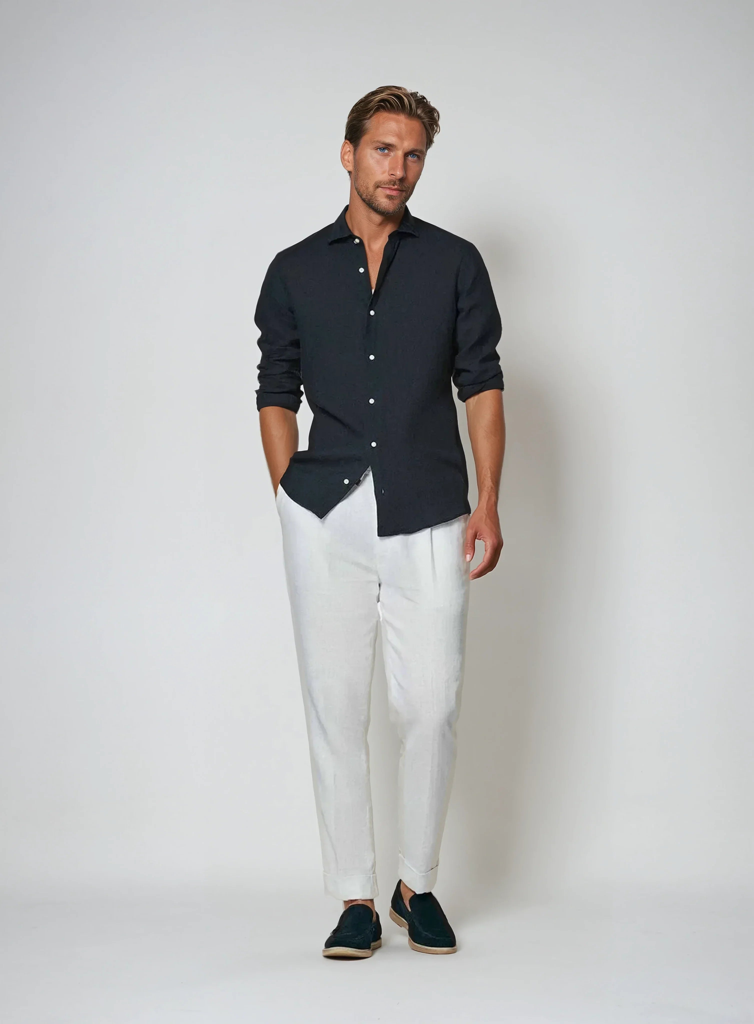 Grand Arbres Námořnická Modrá Lněná Košile je vyráběna s největší péčí a splňuje nejvyšší standardy kvality. Se svou prémiovou úpravou a pozorností k detailům nabízí tato košile dokonalou rovnováhu mezi pohodlím, stylem a univerzálností.