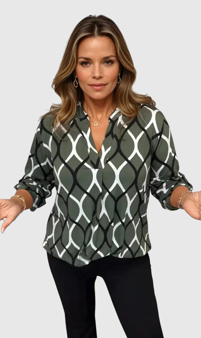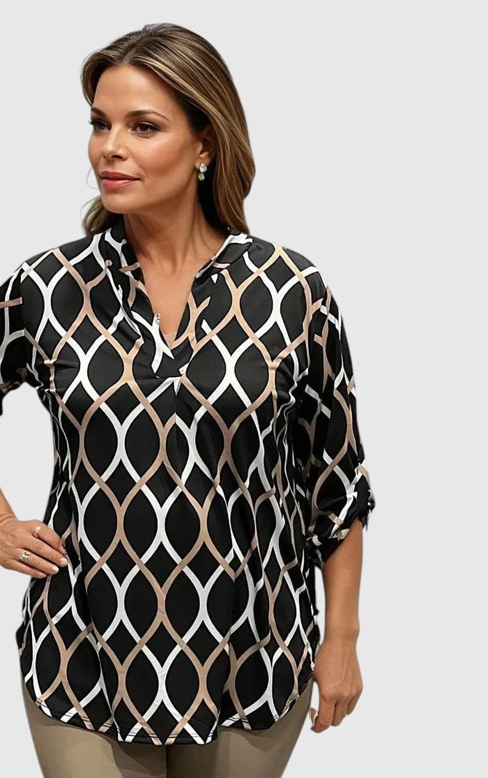 Vyrobena z lehké a prodyšné tkaniny, zaručuje pohodlí po celý den. Volnější střih s výstřihem do „V“ a rukávy 3/4 délky poskytuje nejen komfort, ale také univerzální využití – od pracovních schůzek až po volný čas.
